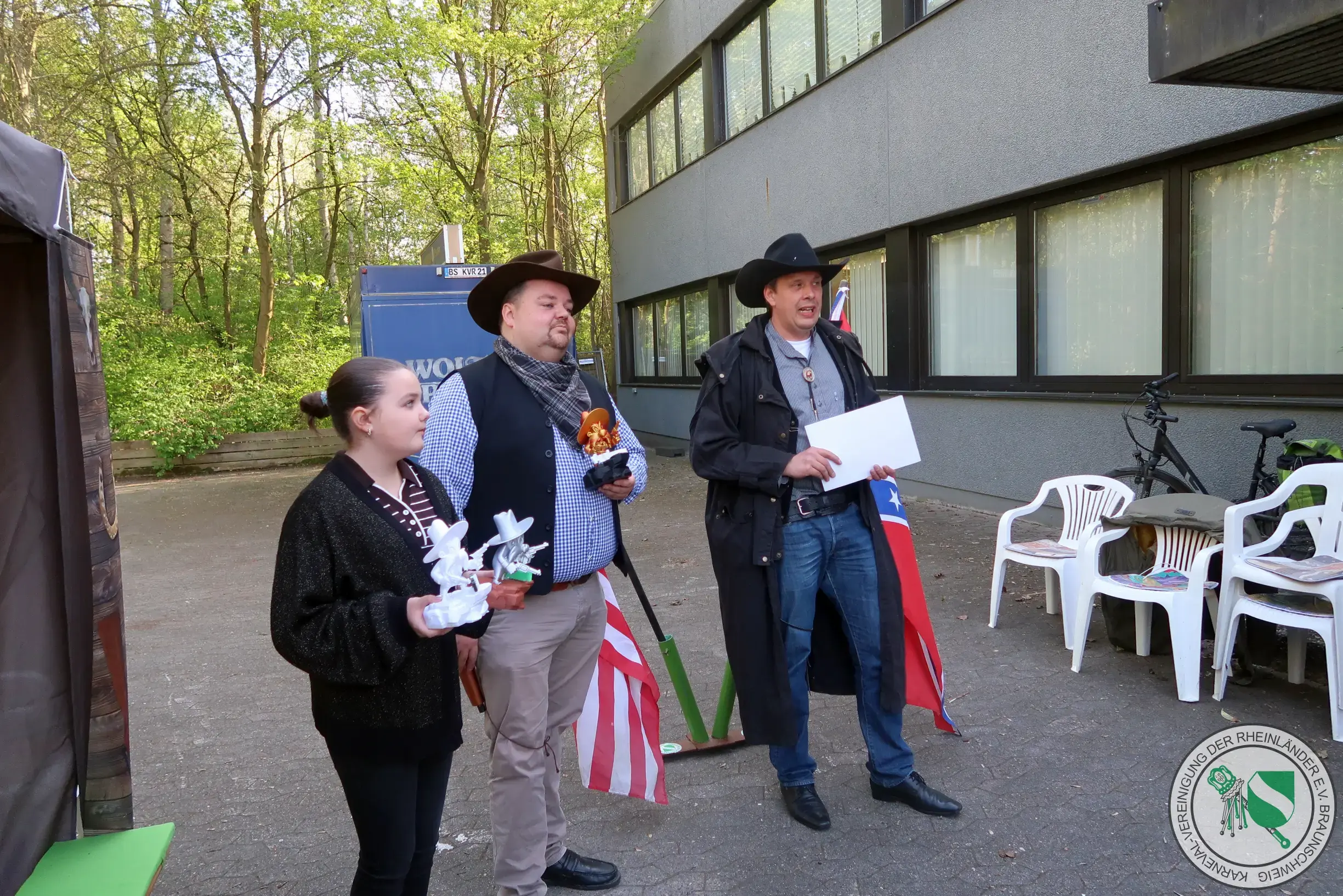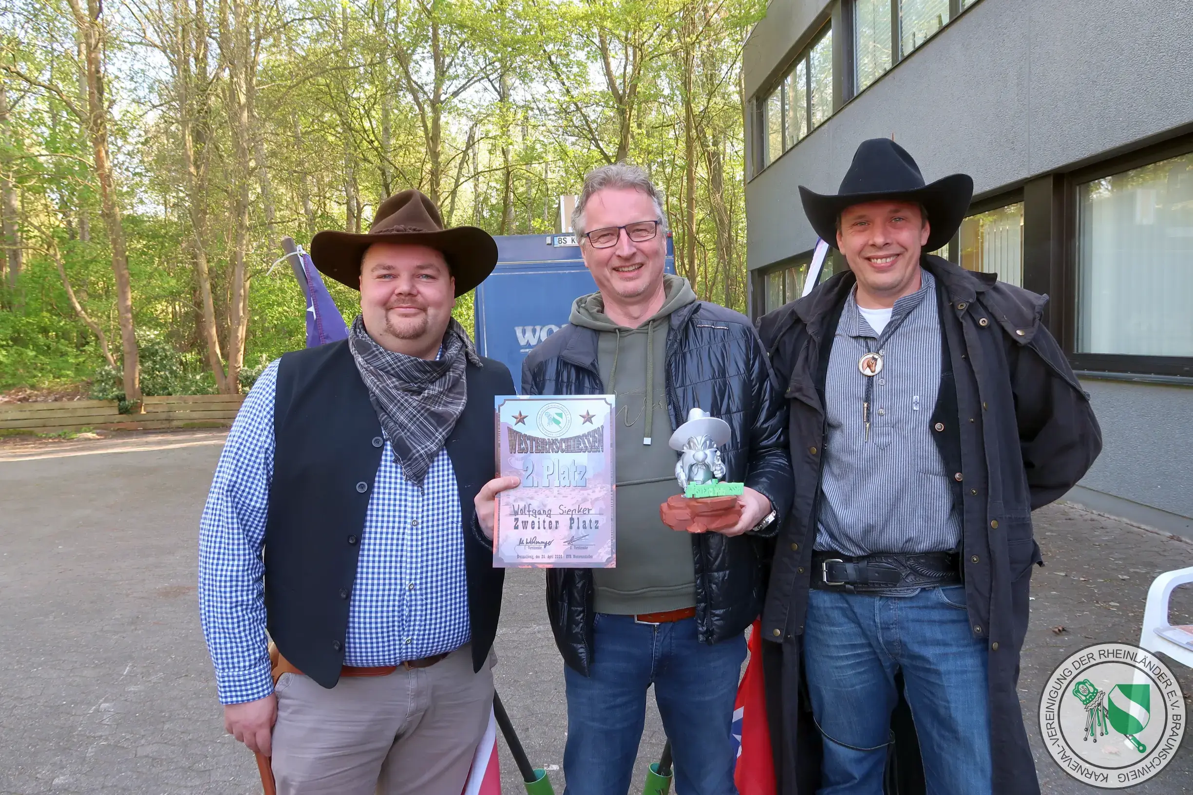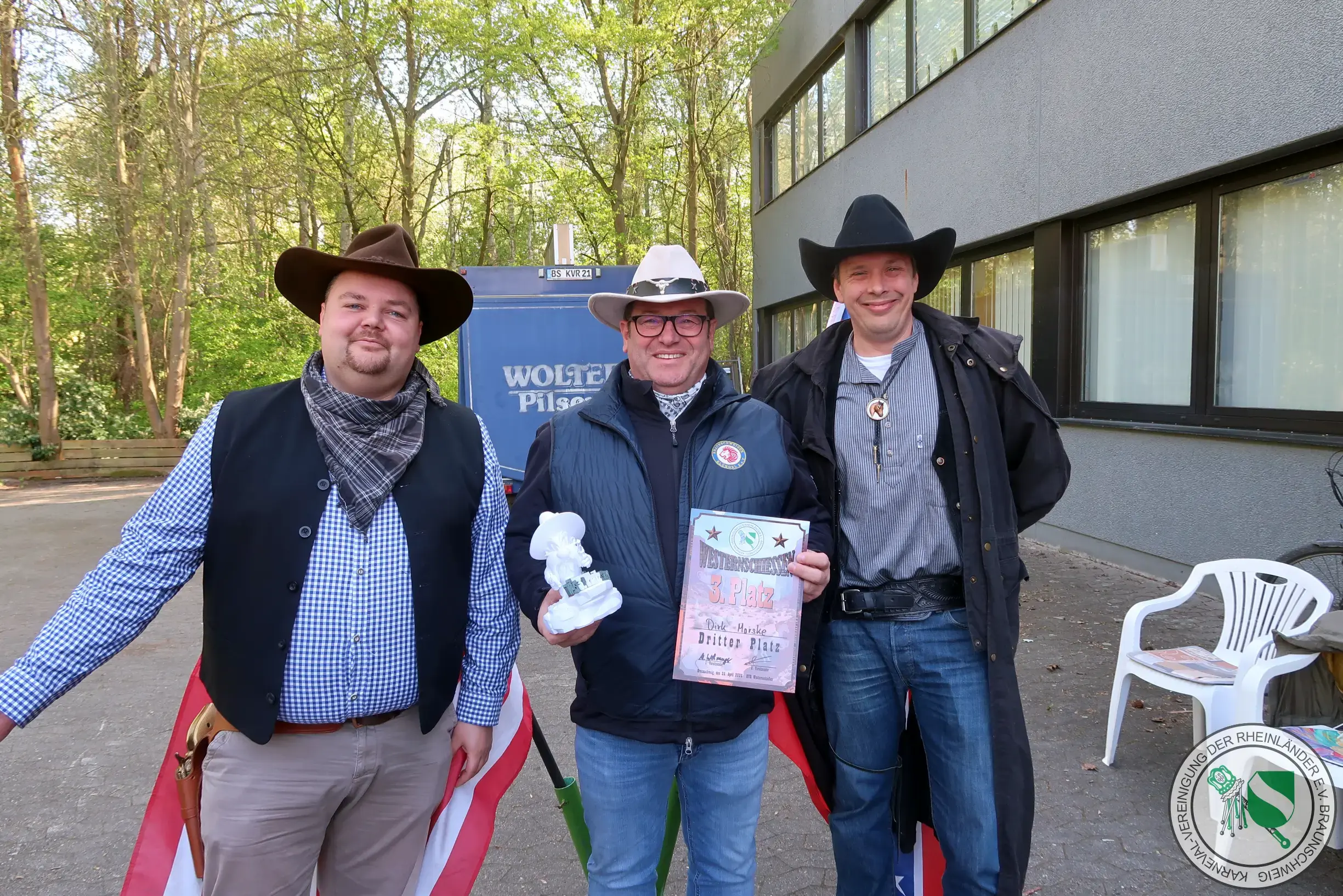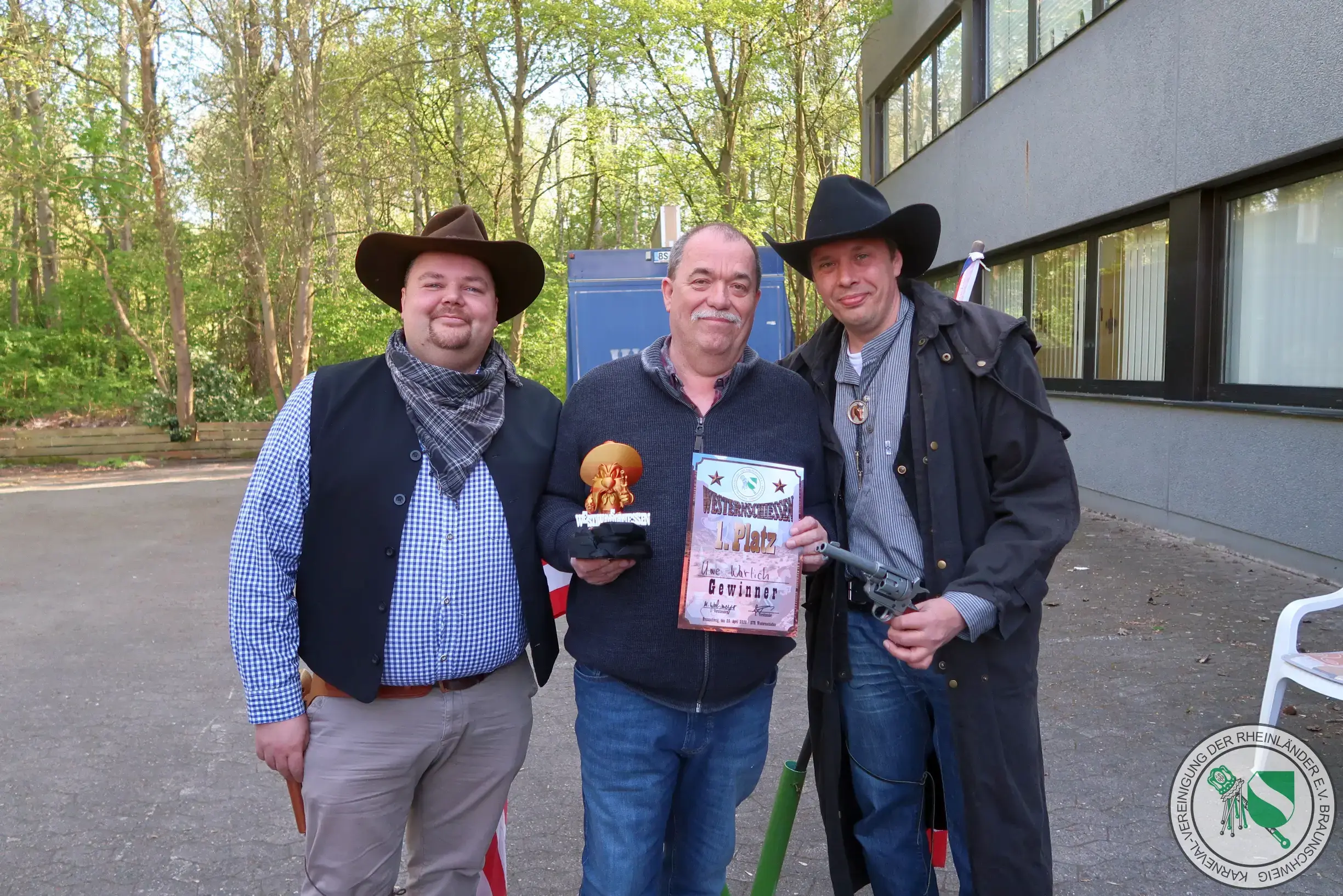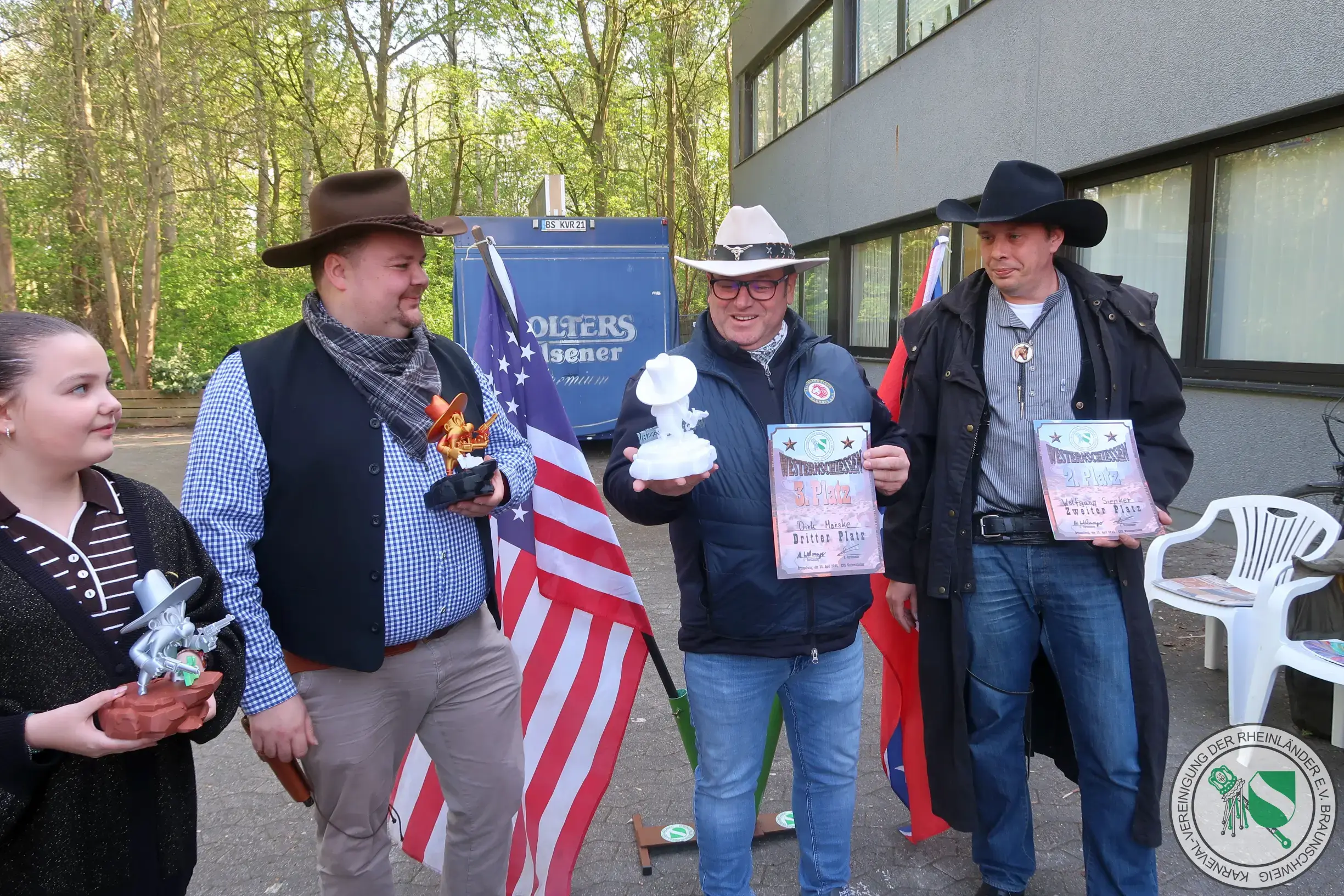 Im Anschluss führte der Weg ins Vereinsheim, wo nicht nur Freunde und Familien auf die Cowboys warteten, sondern auch kalte Getränke und saftige Steaks von der Fleischerei und Partyservice Neubauer. Höhepunkt des Tages war die Preisverleihung: Dirk Marske sicherte sich den 3. Platz, Wolfgang Siepker belegte ganz sportlich den 2. Platz. Die meisten Punkte erzielte Uwe Warlich und landete somit auf Platz 1.