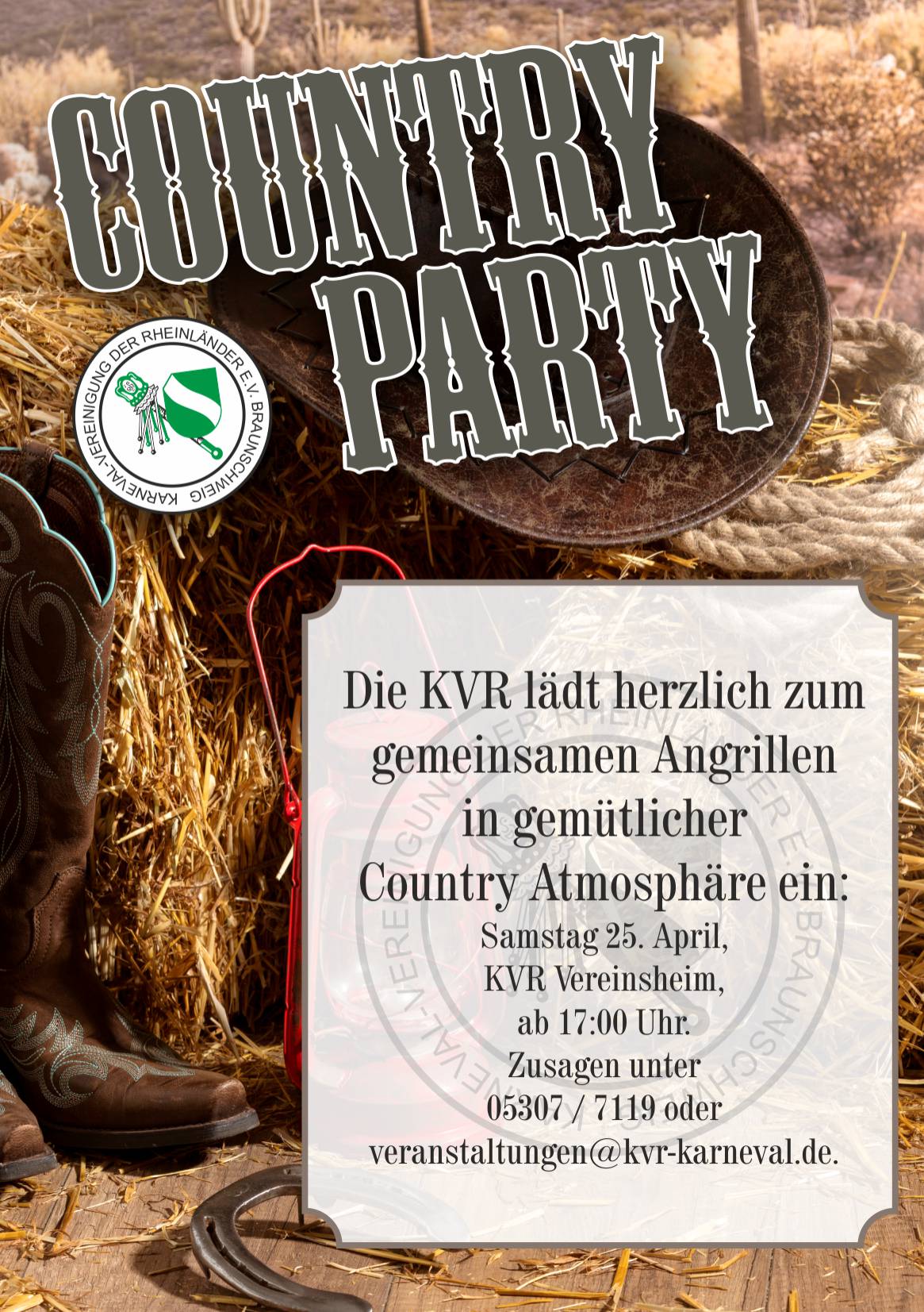 am 25. April ab 17:00 Uhr ist es soweit: Unsere erste Veranstaltung außerhalb des Brauchtums steht an – und wir laden euch ganz herzlich zur Country Party in unserem Vereinsheim ein!