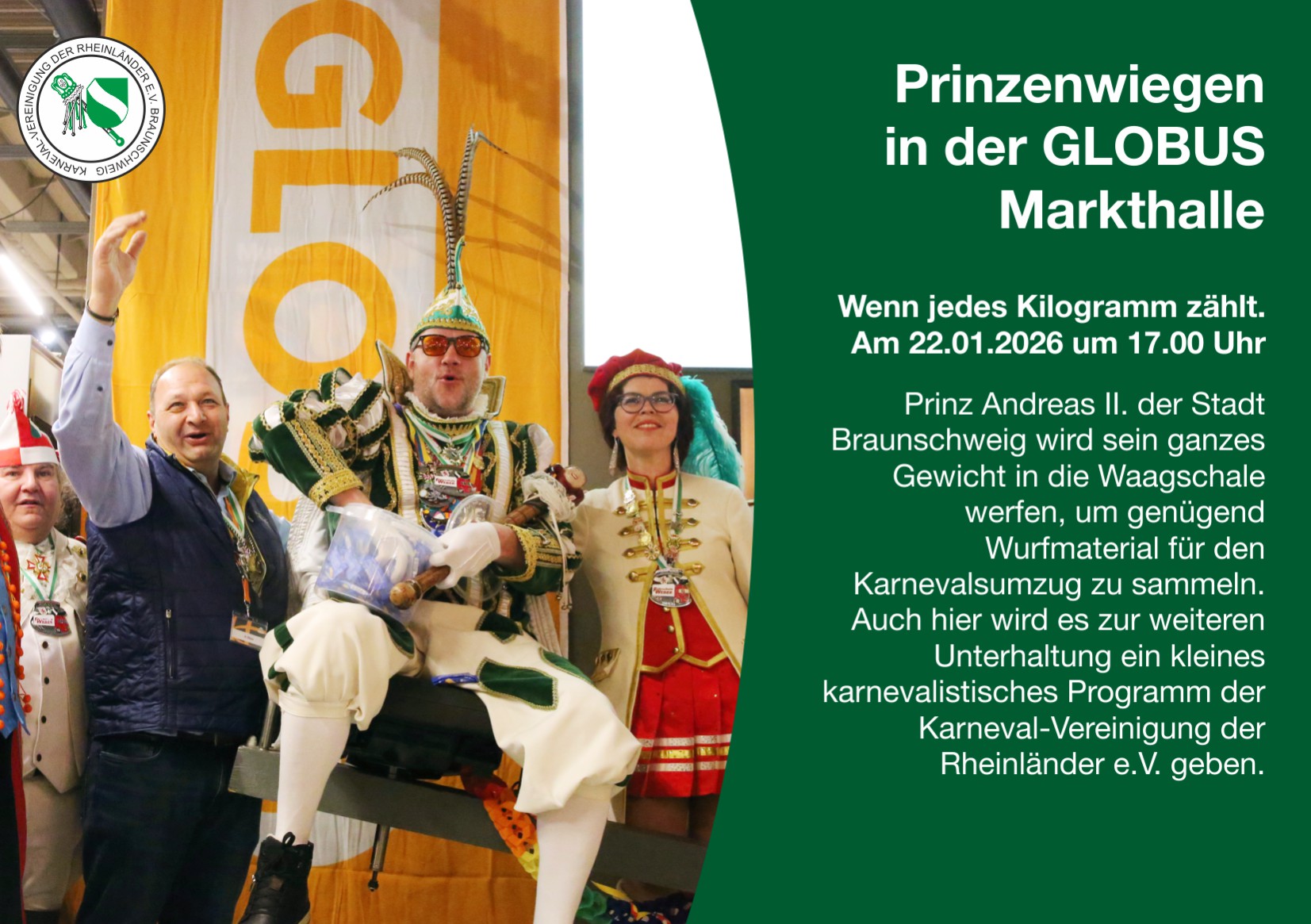 Prinz Andreas II. der Stadt Braunschweig wird sein ganzes Gewicht in die Waagschale werfen, um genügend Wurfmaterial für den Karnevalsumzug zu sammeln. Auch hier wird es zur weiteren Unterhaltung ein kleines karnevalistisches Programm der Karneval-Vereinigung der Rheinländer e.V. geben.